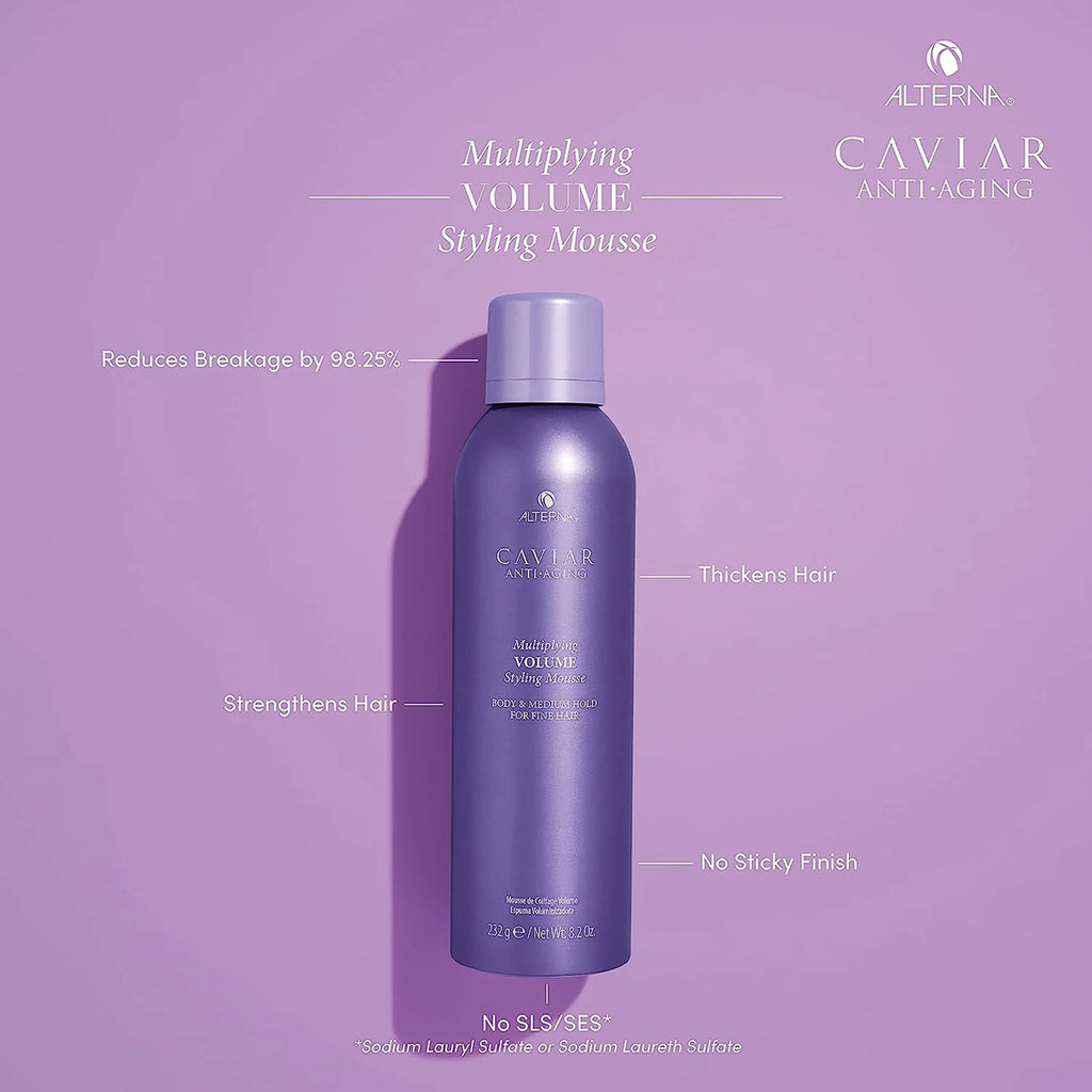 Experience the transformative power of the Caviar Anti-Aging Multiplying Volume Styling Mousse by Alterna. This lightweight styling mousse is a game-changer for all hair types, providing an abundance of volume while reducing breakage by an impressive 98.25%.
